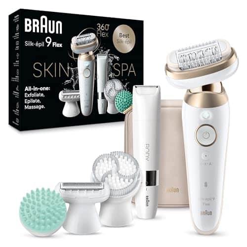 • Product Name: Braun Epilator Silk-épil 9 Flex SkinSpa, Hair Removal Device, 360 Flex and Pivoting Head, Wet and Dry, Includes Shaver Head, Trimmer Comb, Massage Pad, Exfoliation Brush and BodyTrimmer, SES9-481 3D